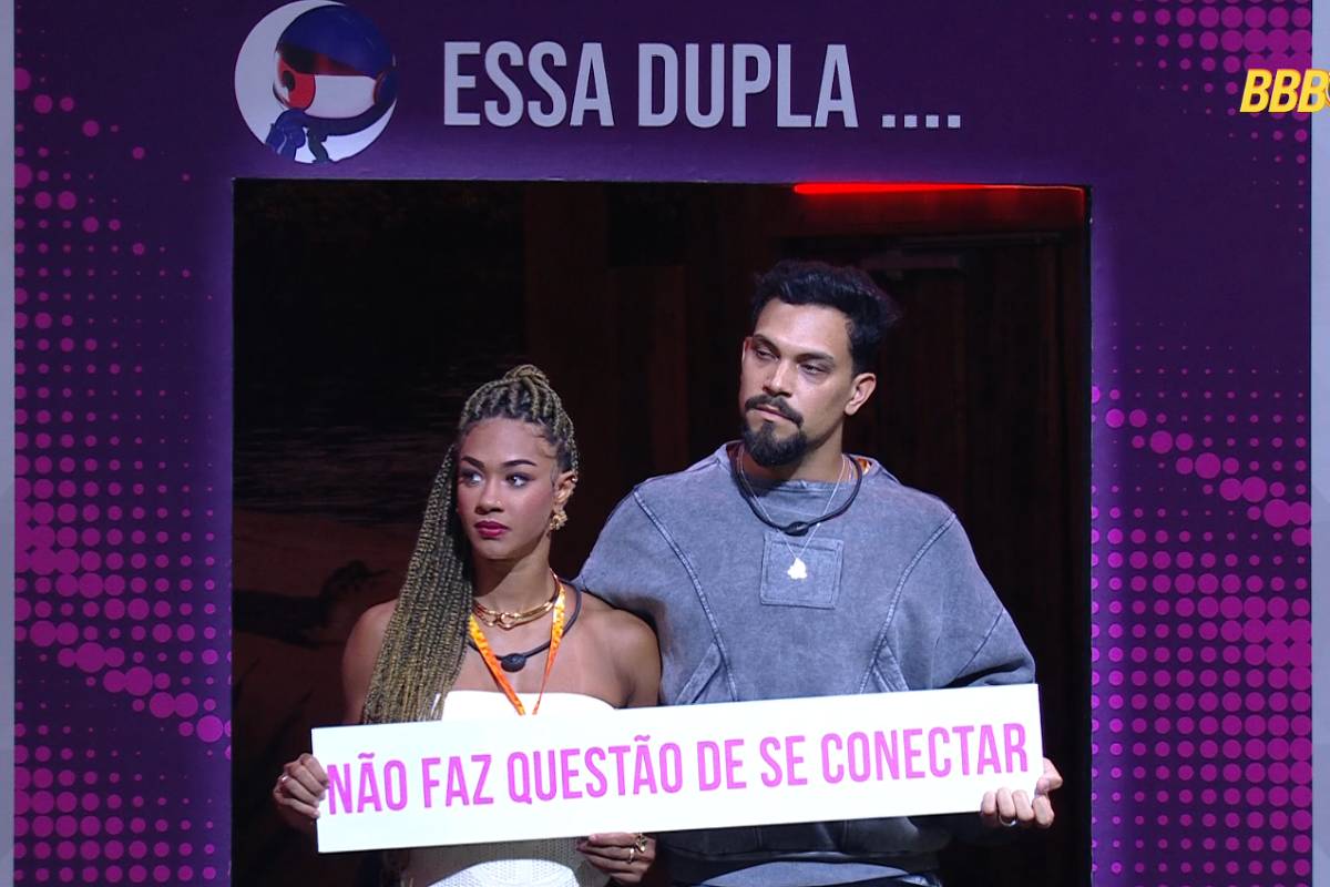 A primeira dupla a jogar, Marcelo e Arleane, escolheu para Aline e Vinícius a placa “não faz questão de se conectar”.