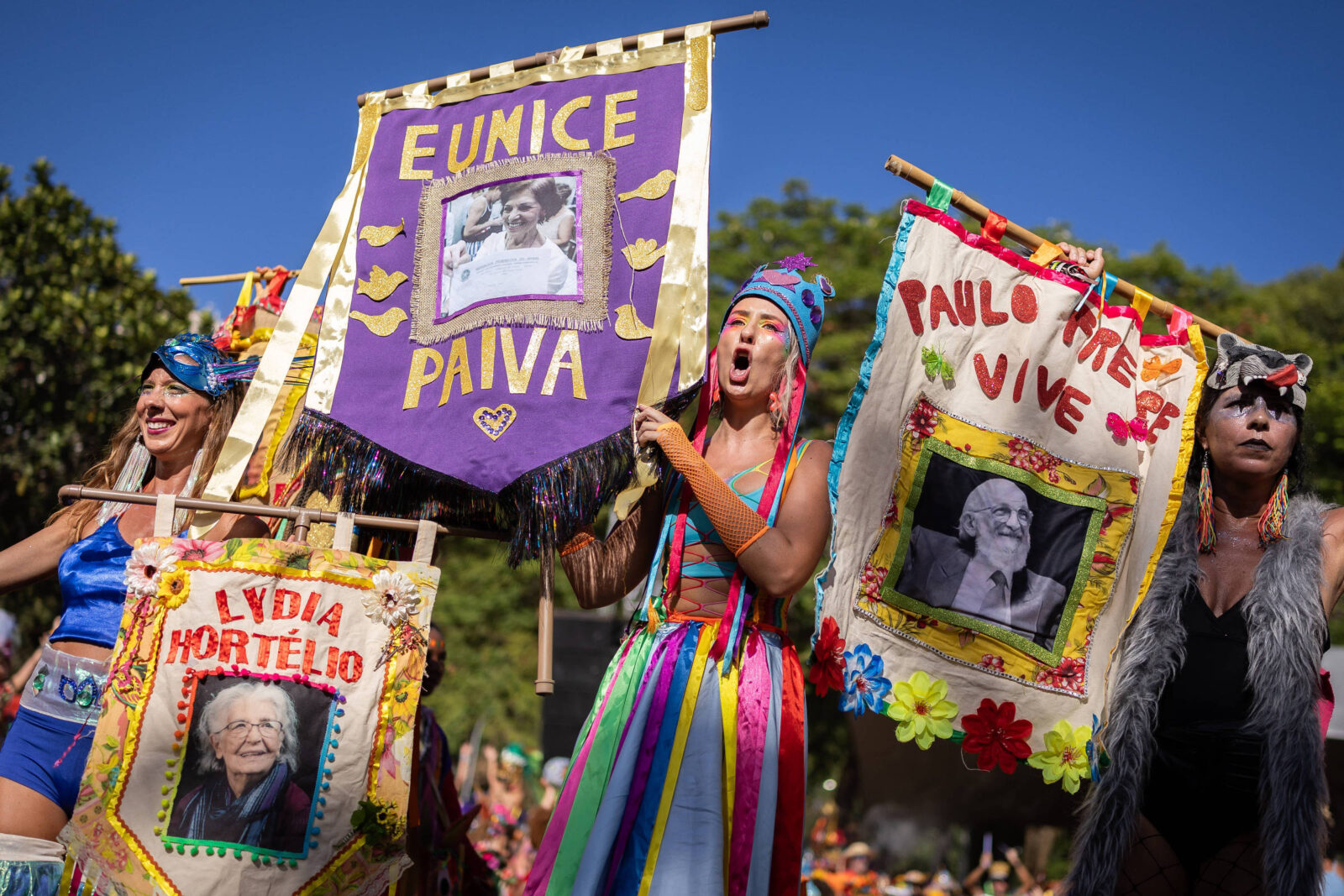 No Rio, além dos gritos de sem anistia, o integrantes do Bloco da Terreirada homenagearam Eunice Paiva, interpretada pela atriz Fernanda Torres no filme “Ainda Estou Aqui“, que recebeu três indicações ao Oscar. O retrato da advogada que lutou pelo reconhecimento do marido, Rubens Paiva, como vítima da ditadura, foi exibido em estandartes ao lado do educador e filósofo Paulo Freire e outros nomes.