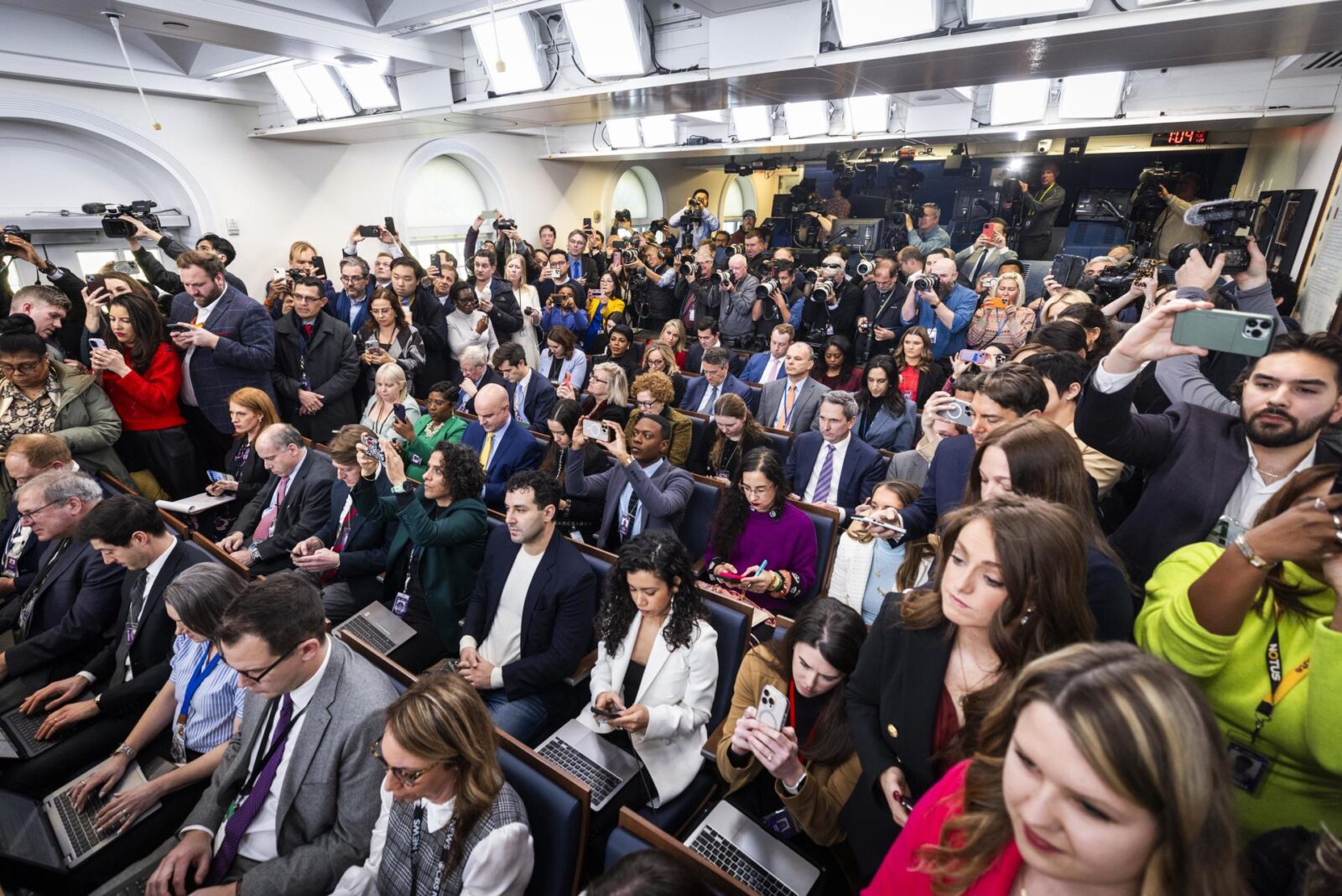 A primeira fileira é reservada para a agência Associated Press e para os correspondentes das principais redes de televisão americanas: NBC, Fox, CBS, ABC e CNN. A segunda fileira é ocupada pelos principais jornais, como The Wall Street Journal, The Washington Post e The New York Times, entre outros.