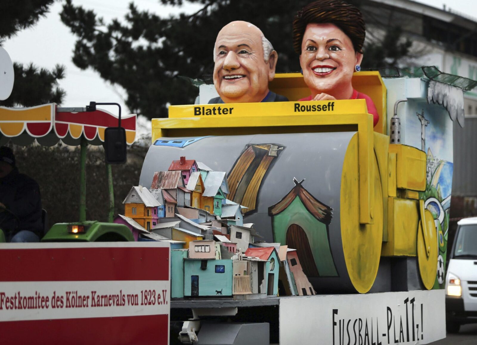 Os altos gastos com a Copa do Mundo de 2014, sediada no Brasil, foram outro ponto central das críticas. Um dos principais carros alegóricos de Colônia mostrava Dilma Rousseff sentada ao lado do então presidente da Fifa, Joseph Blatter, sobre um rolo compressor que retirava do caminho uma favela. A crítica fazia alusão às pessoas que foram despejadas para dar lugar às vias e aos estádios da Copa do Mundo no Brasil.