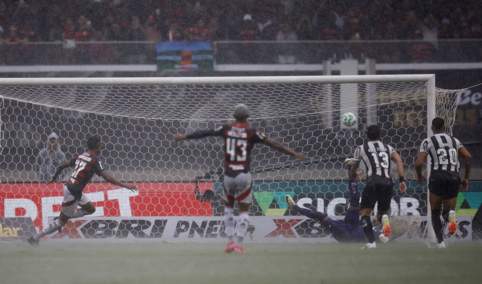 A tempestade virou uma chuva mais leve e a equipe que passa os rodos no gramado entrou em ação, principalmente na área dos gols, que acumulou poças d’água que tiravam muita velocidade da bola. O jogo ficou interrompido por mais de uma hora e recomeçou às 17h29.