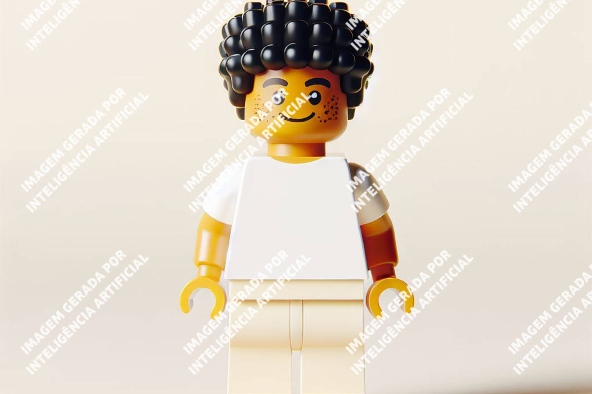 “Faça uma imagem de um menino em formato de Lego, com corpo amarelo e roupas brancas. Mostre o corpo inteiro dele. Ele tem cabelo encaracolado e preto, sorri e possui sardas no rosto. Estilo 3D, fundo simples”.