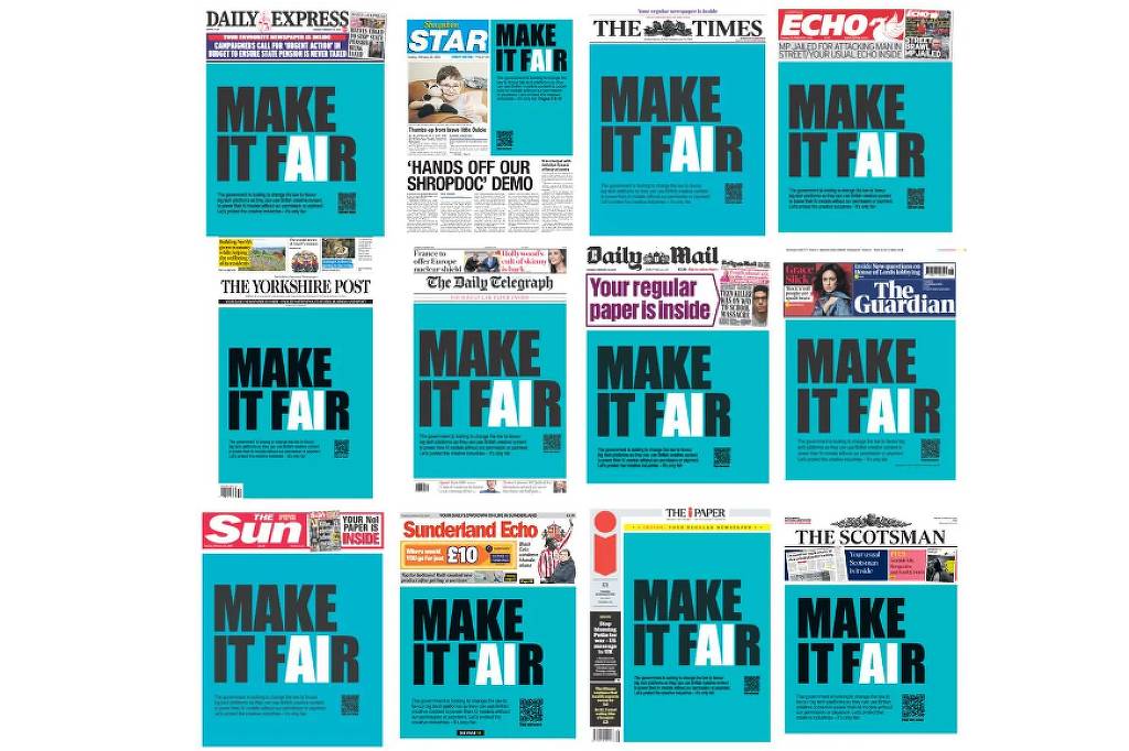 Em todas as publicações, o slogan vem acompanhado do seguinte texto: “FAÇA SER JUSTO: O governo quer mudar as leis do Reino Unido para favorecer grandes plataformas de tecnologia para que elas possam usar o conteúdo criativo britânico para alimentar seus modelos de IA sem nossa permissão ou pagamento. Vamos proteger as indústrias criativas –é justo”.