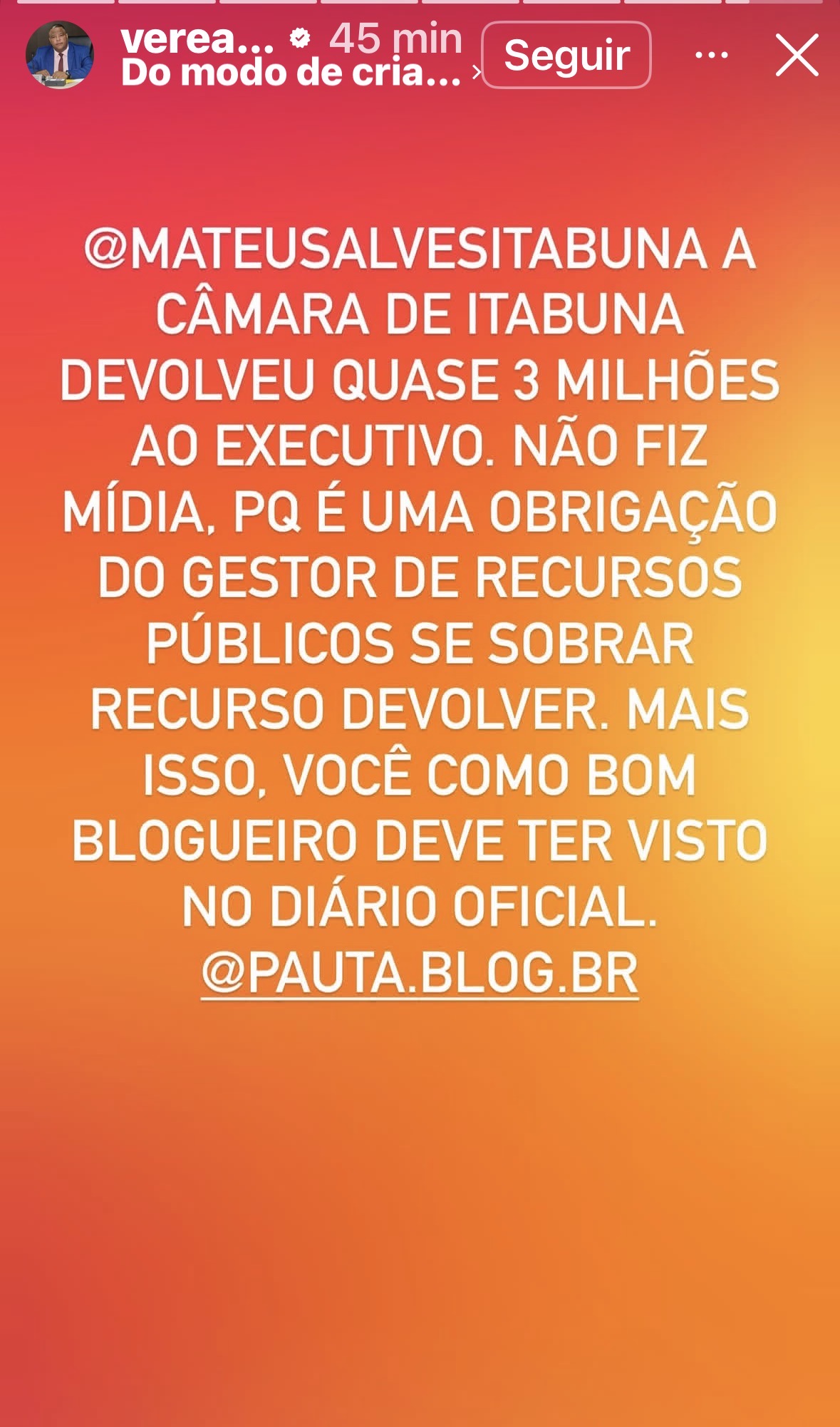 A recente publicação do presidente da Câmara Municipal de Itabuna, Manoel Porfirio, celebrando a devolução de quase R$ 3 milhões do duodécimo ao Executivo, vai além de um simples informe financeiro. Ela levanta questionamentos sérios sobre gestão, prioridades administrativas e postura institucional.