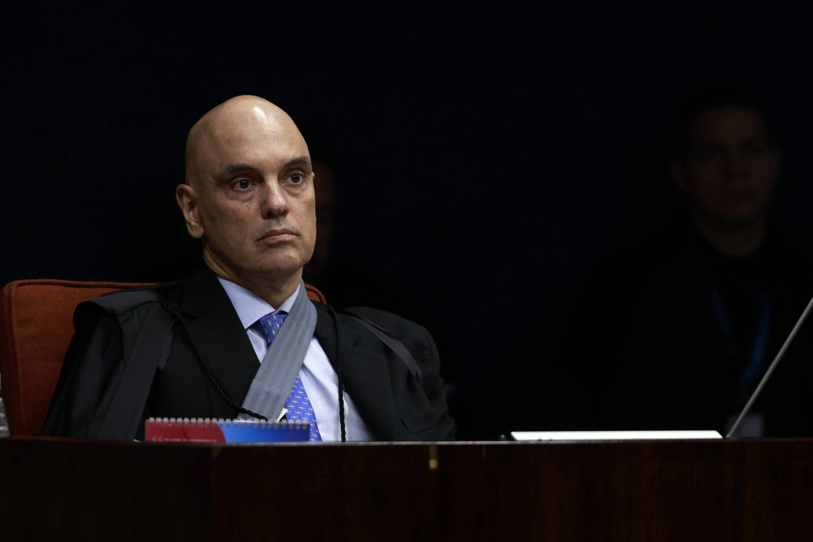 O ministro Alexandre de Moraes, do STF (Supremo Tribunal Federal), participa da sessão da Primeira Turma da corte nesta terça-feira (22) com uma tipoia no braço direito.