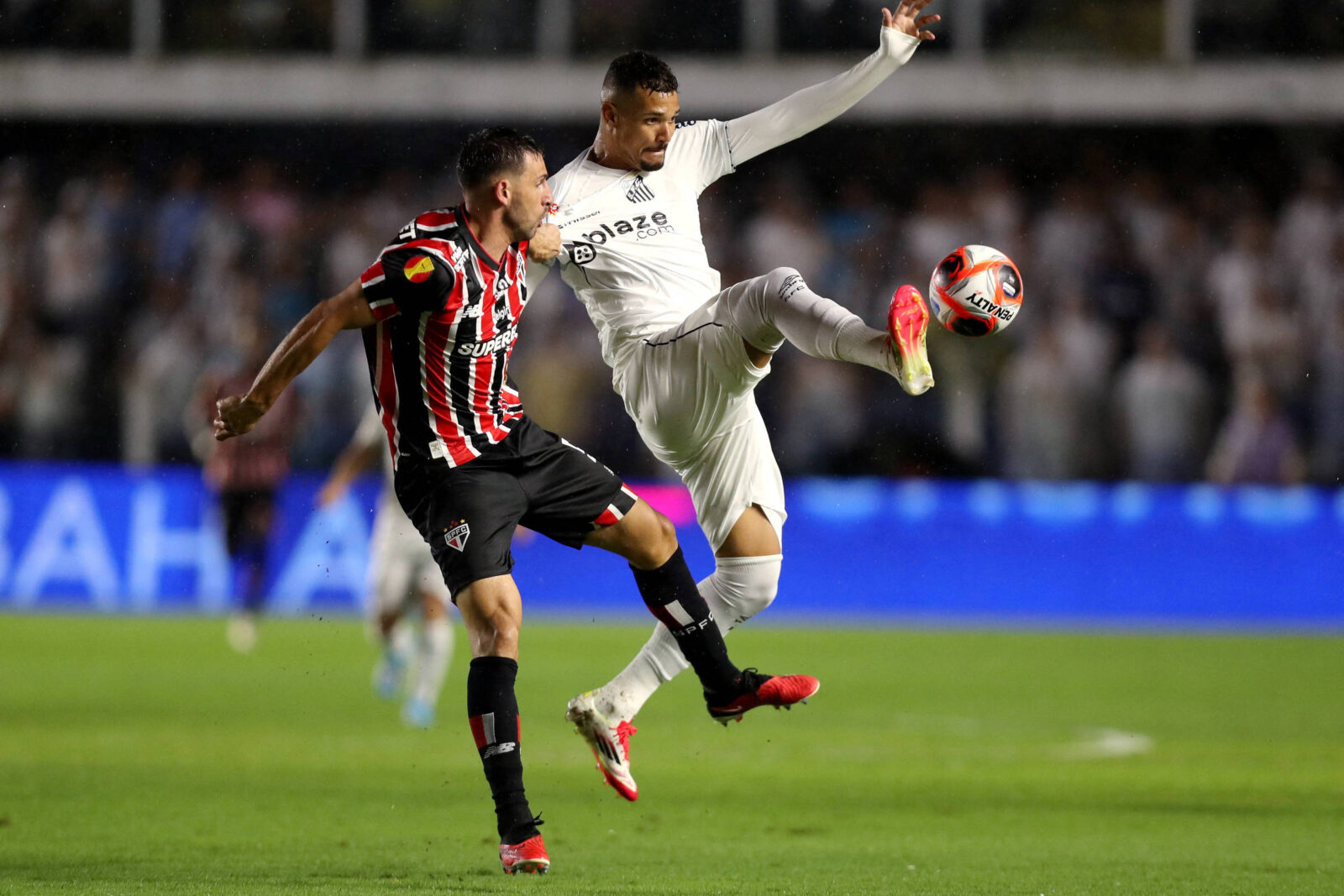 Sob chuva e num gramado enlameado, o time tricolor abriu o placar com um gol de Lucas Moura aos 35 do primeiro tempo. Não demorou para que o Santos conseguisse o empate, aos 42 minutos, com um gol de rebote de Guilherme. Foi o gol 13 mil da história do alvinegro.