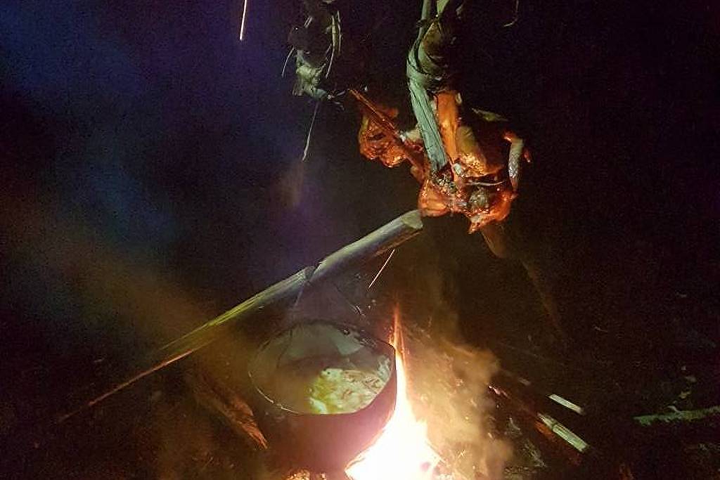 E lá fui eu para o meio do mato, feliz feito pinto no lixo (ou onça na mata), para essa viagem que foi uma das mais incríveis de minha vida de trilheira bissexta. Foram cinco dias sem celular, telefone, televisão, longe de qualquer shopping center muvucado e comendo sem enfrentar filas as habituais iguarias de acampamento —o indefectível macarrão com molho de caixinha, biscoitos e mix de castanhas. O brinde era com água, fervida para purificação (ninguém em sã consciência vai querer encher a mochila de água mineral para ir ao lugar do planeta onde chove montes, não à toa chamado pelos anglo-saxões de rain forest, ou floresta de chuva). Eventualmente, em alguma das aldeias do caminho, rolava um cauim ou caxiri, as bebidas feitas a partir da mandioca fermentada, acompanhadas de um bom rabo de jacaré na brasa, um banquete de luxo que os indígenas nos ofereciam.
