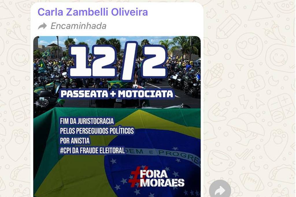 A deputada federal Carla Zambelli (PL-SP) divulgou nesta quinta-feira (6) mensagem em um grupo de WhatsApp com informações sobre passeata e motociata marcadas para a próxima quarta-feira (12) em São Paulo contra o ministro Alexandre de Moraes, do STF (Supremo Tribunal Federal).